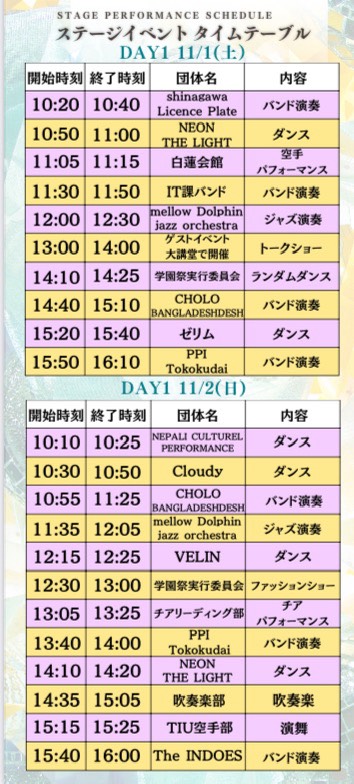11月1日(土) ステージイベント(開催時間にご注意ください)噴水前特設ステージ及び大講堂で開催される企画の一覧となります!掲載は順不同となります。開催日時...